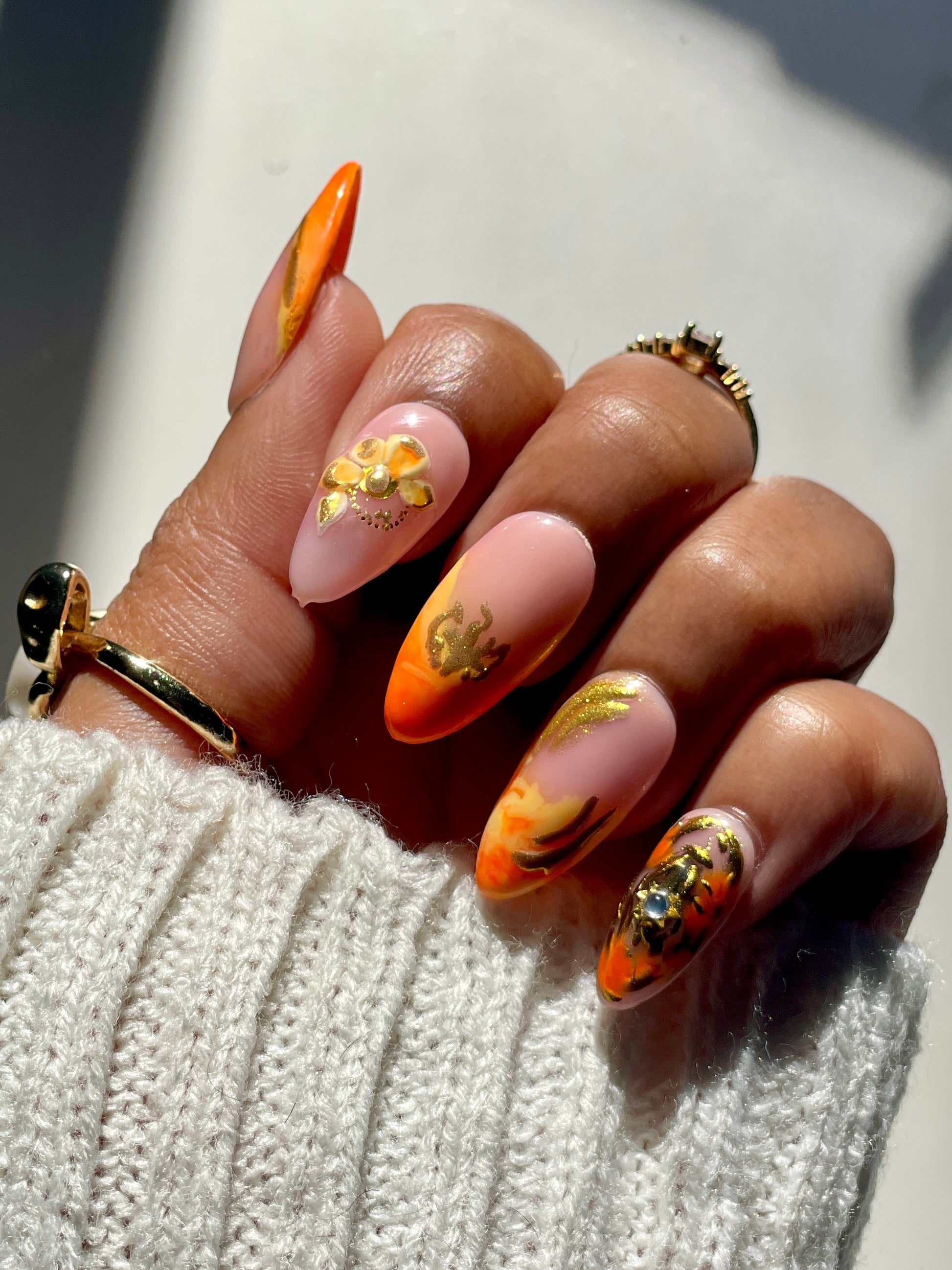 Ignite your style with Ember Bloom—a luxurious hand-painted press-on nail set that captures the warmth of glowing embers and the elegance of blooming florals.