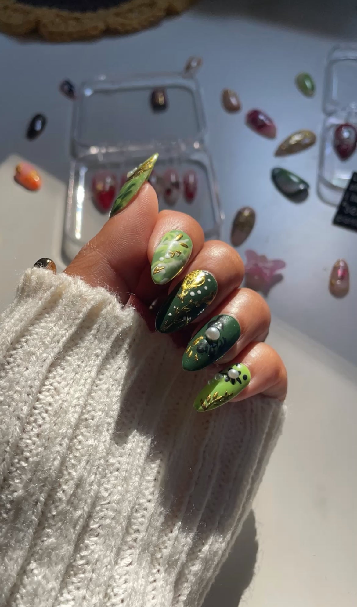 Elevate your manicure with Quiet Opulence, a stunning hand-painted press-on nail set that brings together rich emerald green and luxurious gold accents.